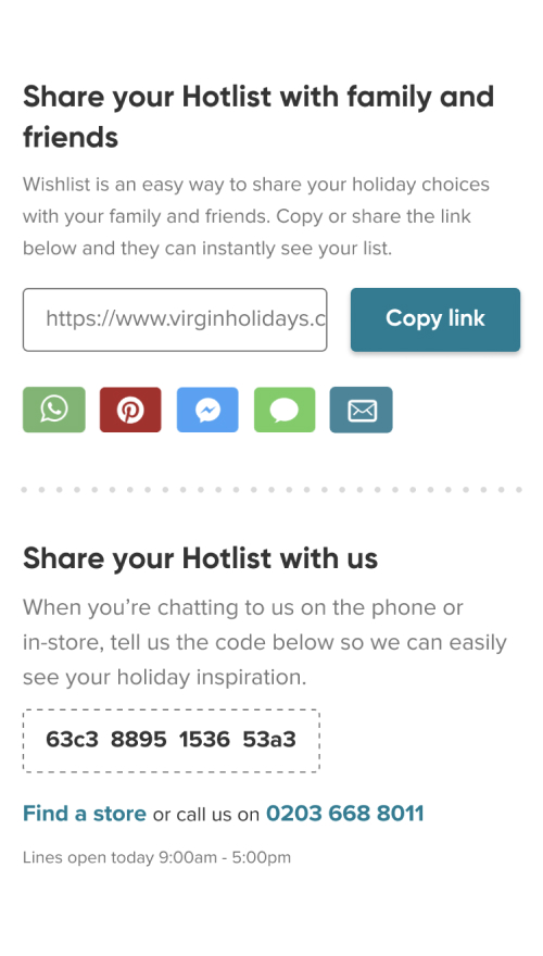 Out of the box benefits included the ability to save destination pages, hotels, search results and holidays with saved options. You can also create multiple lists which can be shared with members of your party, a Virgin Holidays expert, or even yourself – all without the need to create an account.