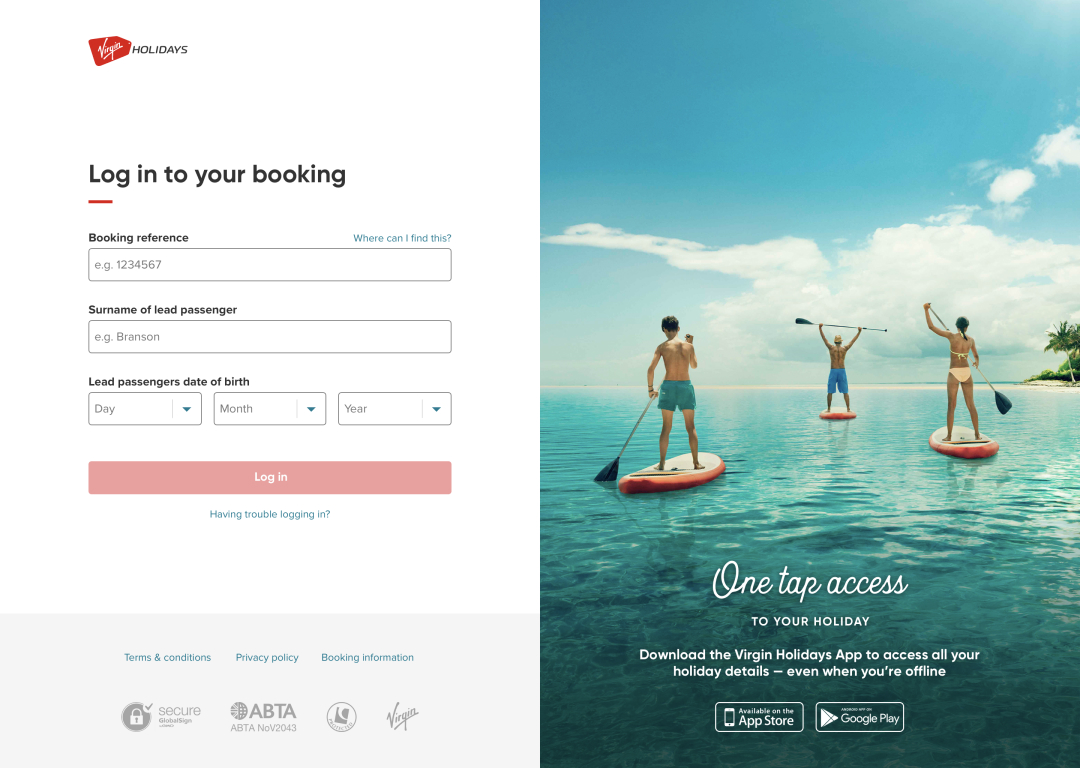 I designed a white label version of the screen, that met AA WCAG standards and had a consistent UI that pulled in the relevant theme (Virgin brand pattern library) depending on the type of booking the customer was logging in to.